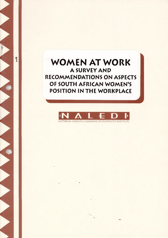 - The research report emanates from the NALEDI Women and Work research group. In 1994 COSATU's Congress called for the establishment of a research group at NALEDI to explore the position of women workers. After discussions between COSATU National Women's Sub-Committee and NALEDI, the Women and Work Project was conceived. The project comprises of two research programmes: firstly, an examination of the problems experienced by women at the workplace, and, secondly, an examination of the position of women in the trade unions. This report is the first leg of that project. It is envisaged that the second leg (on women in trade unions), will be completed by the end of 1995. This report is primarily aimed at synthesising existing literature and does not necessarily generate new information. The report identifies key problems experienced by women at the workplace and recommends policy options for unions, employers and the government. However, the report does not consider all problems experienced by women at the workplace. For example, key issues like education, training,' health and safety are not dealt with here.