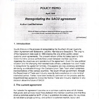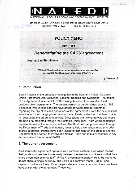 - South Africa is in the process of renegotiating the Southern African Customs Union Agreement with Botswana, Lesotho, Namibia and Swaziland. The origins of the Agreement date back to 1889 making this one of the world's oldest customs union agreements. The present version of the Act dates back to 1969. Since that time various conflicts have arisen between member countries regarding the objectives and operations of the agreement. Given the new political situation and the changing international trade climate, a decision has been made to renegotiate the agreement entirely. Discussions are now underway and these are being co-ordinated through the Customs Union Task Team which comprises representatives of the various countries. The South African government, through the Department of Trade and Industry recently held a workshop in order to brief interested parties. Parties have been invited to comment on the process and the Department has agreed to involve the Nedlac Trade and Industry chamber in any decision about the future of SACU.