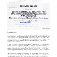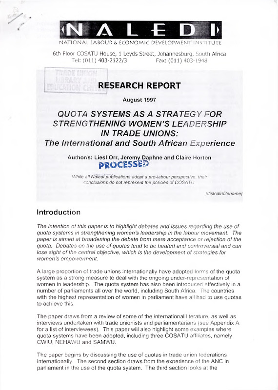 - The intention of this paper is to highlight debates and issues regarding the use of guota systems in strengthening women's leadership in the labour movement. The paper is aimed at broadening the debate from mere acceptance or rejection of the guota. Debates on the use of guotas tend to be heated and controversial and can lose sight of the central objective, which is the development of strategies for women's empowerment. A large proportion of trade unions internationally have adopted forms of the quota system as a strong measure to deal with the ongoing under-representation of women in leadership. The quota system has also been introduced effectively in a number of parliaments all over the world, including South Africa. The countries with the highest representation of women in parliament have all had to use quotas to achieve this. The paper draws from a review of some of the international literature, as well as interviews undertaken with trade unionists and parliamentarians (see Appendix A for a list of interviewees). This paper will also highlight some examples where quota systems have been adopted, including three COSATU affiliates, namely CWIU, NEHAWU and SAMWU.
