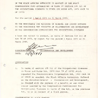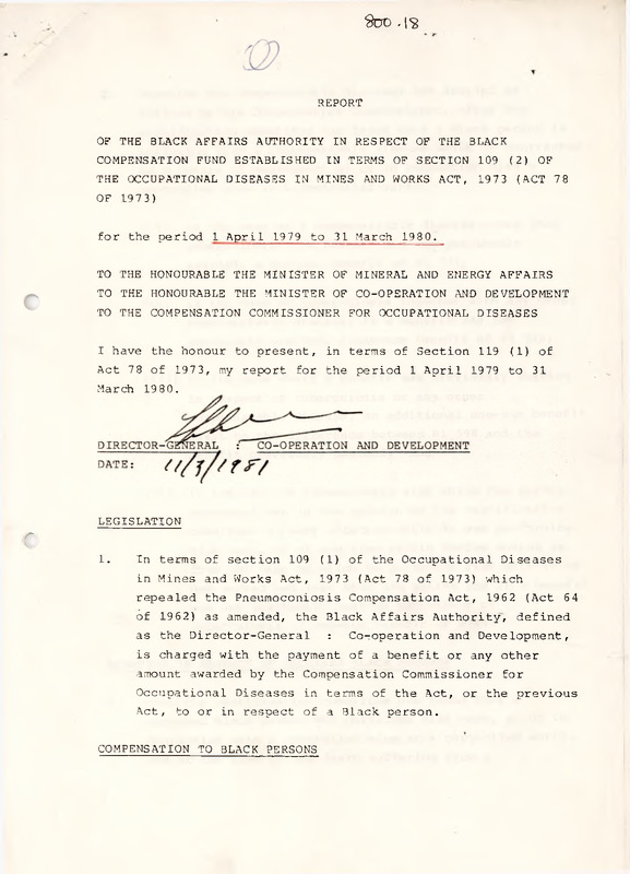 - In terms of section 109 (1) of the Occupational Diseases in Mines and Works Act, 1973 (Act 78 of 1973) which repealed the Pneumoconiosis Compensation Act, 1962 (Act 64 of 1962) as amended, the Black Affairs Authority, defined as the Director-General : Co-operation and Development, is charged with the payment of a benefit or any other amount awarded by the Compensation Commissioner for Occupational Diseases in terms of the Act, or the previous Act, to or in respect of a Black person.