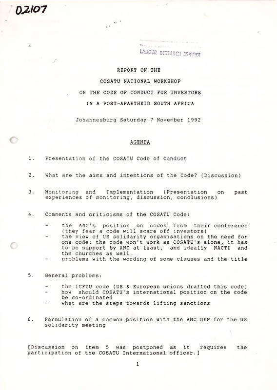 - Report on the COSATU national workshop on the code of conduct for investors in a post-apartheid South Africa