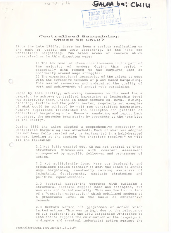 - Since the late 1980's, there has been a serious realisation on the part of Cosatu and CWIU leadership, of the need for Centralised Bargaining. Two broad areas of concern which pressurised us in this direction were: 1) The low level of class consciousness on the part of the majority of members during this period especially with regard to the complete lack of solidarity around wage struggles. 2) The organisational incapacity of the unions to cope with the excessive demands of plant based bargaining. This wasted resources and undermined the quality of work and achievement of annual wage bargaining. Faced by this reality, achieving consensus on the need for a campaign to achieve centralised bargaining at leadership level was relatively easy. Unions in other sectors eg. metal, mining, clothing, textile and the public sector, regularly set examples of what could be achieved by well run centralised bargaining. Numsa's experience illustrated the strengths and pitfalls of centralised bargaining - ie. Numsa's mandating and report back processes, the Mercedes Benz strike by opponents to the "one bite at the cherry".