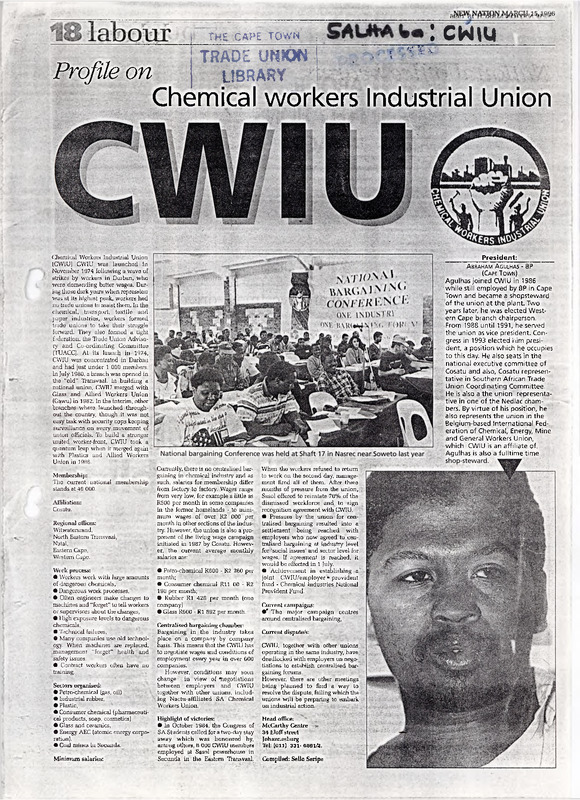 - Chemical Workers Industrial Union (GW1U) CW1U wus launched in November 1074 following a wuvo of strikes by workers in Durban, who wero demanding bettor wages. During those dark yours when repression wus at its highest peak, workers hud no hade unions to assist them. In chemical, transport, textile and .paper industries, workers formed trade unions to take their struggle forward. They also formed a tight .federation, the Trade Union Advisory and Co-ordinating Committee (TUACC). At its launch in 1974, CWIU was concentrated in Durban and had just under 1 000 members. In July 1980, a branch was opened in the "old†Transvaal. In building a national union, CWIU merged with Glass and Allied Workers Union (Gawu) in 1982. In the interim, other branches where launched throughout the country, though it was easy task with security cops keeping surveillance on every movement of union officials. To build a stronger united worker-front, CWIU took quantum leap when it merged again with Plastics and Allied Workers Union in 1986.