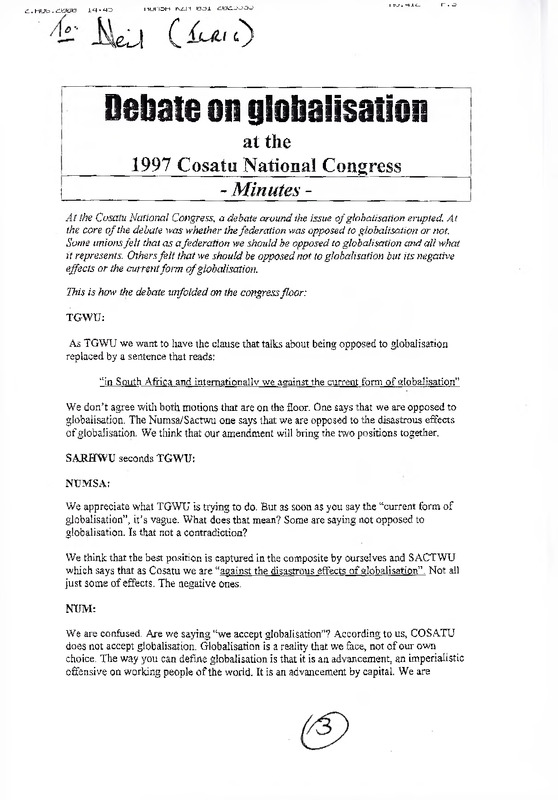 - At the Cosatu National Congress, a debate around the issue of globalisation erupted. At the core of the debate was whether the federation was opposed to globalisation or not. Some unions fell that as a federation we should be opposed to globalisation and all what it represents. Others felt that we should be opposed not to globalisation but its negative effects or the current form of globalisation.