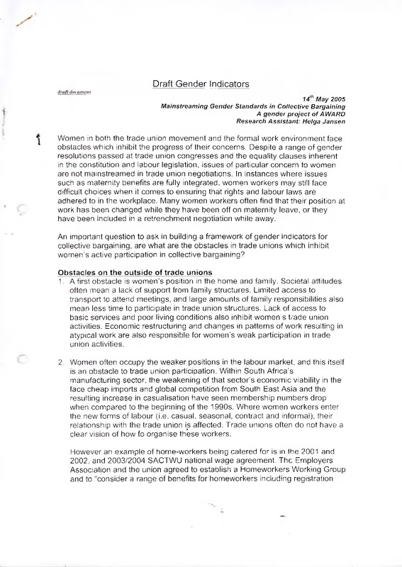 - Women in both the trade union movement and the formal work environment face obstacles which inhibit the progress of their concerns. Despite a range of gender resolutions passed at trade union congresses and the equality clauses inherent in the constitution and labour legislation, issues of particular concern to women are not mainstreamed in trade union negotiations. In instances where issues such as maternity benefits are fully integrated, women workers may still face difficult choices when it comes to ensuring that rights and labour laws are adhered to in the workplace. Many women workers often find that their position at work has been changed while they have been off on maternity leave, or they have been included in a retrenchment negotiation while away. An important question to ask in building a framework of gender indicators for collective bargaining, are what are the obstacles in trade unions which inhibit women's active participation in collective bargaining?