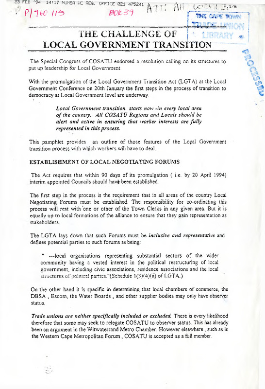 - This pamphlet provides an outline of those features of the Local Government transition process, with which workers will have to deal.