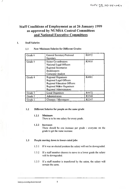 - Staff Conditions of Employment as at 26 January 1999 as approved by NUMSA Central Committees and National Executive Committees