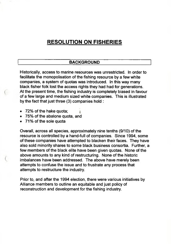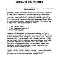 - Historically, access to marine resources was unrestricted. In order to facilitate the monopolisation of the fishing resource by a few white companies, a system of quotas was introduced. In this way many black fisher folk lost the access rights they had had for generations. At the present time, the fishing industry is completely biased in favour of a few large and medium sized white companies. This is illustrated by the fact that just three (3) companies hold : • 72% of the hake quota; • 75% of the abalone quota, and • 71 % of the sole quota Overall, across all species, approximately nine tenths (9/10) of the resource is controlled by a hand-full of companies. Since 1994, some of these companies have attempted to blacken their faces. They have also sold minority shares to some black business consortia. Further, a few members of the black elite have been given quotas. None of the above amounts to any kind of restructuring. None of the historic imbalances have been addressed. The above have merely been attempts to confuse the issue and to frustrate any process that attempts to restructure the industry.