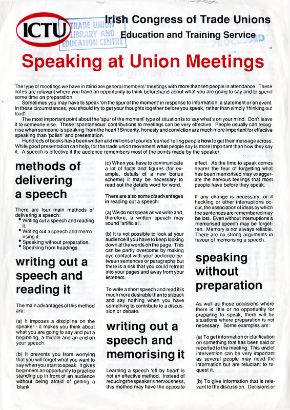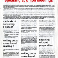 - The type of meetings we have in mind are general members' meetings with more than ten people in attendance. These notes are relevant where you have an opportunity to think beforehand about what you are going to say and to spend some time on preparation. Sometimes you may have to speak 'on the spur of the moment' in response to information, a statement or an event. In these circumstances, you should try to get your thoughts together before you speak, rather than simply 'thinking out loud'. The most important point about the 'spur of the moment' type of situation is to say what's on your mind. Don't leave it to someone else. These 'spontaneous' contributions to meetings can be very effective. People usually can recognise when someone is speaking 'from the heart'! Sincerity, honesty and conviction are much more important for effective speaking than 'polish' and presentation. Hundreds of books have been written and millions of pounds 'earned' telling people how to get their message across. While good presentation can help, for the trade union movement what people say is more important than how they say it. A speech is effective if the audience remembers most of the points made by the speaker.