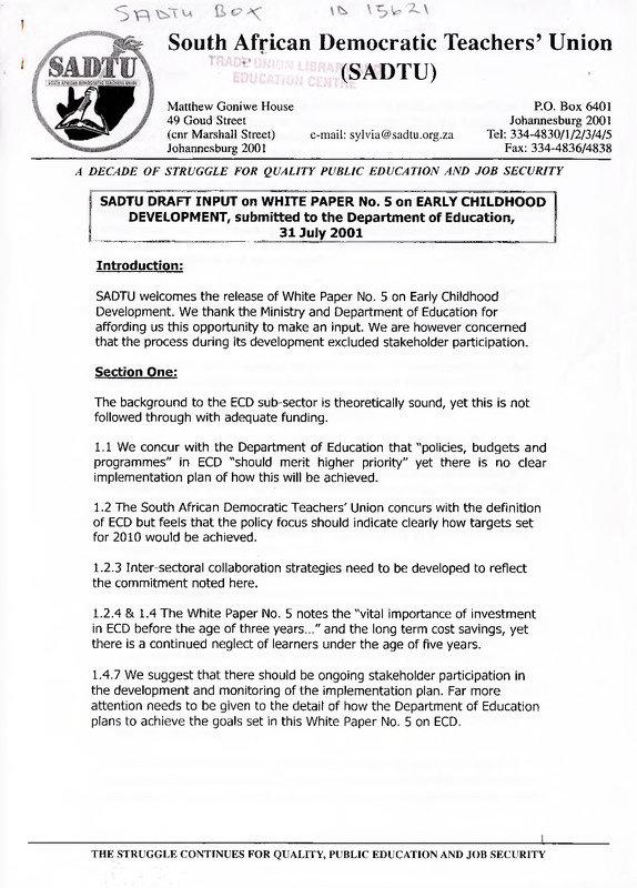 - SADTU draft input on WHITE PAPER No. 5 on early childhood development