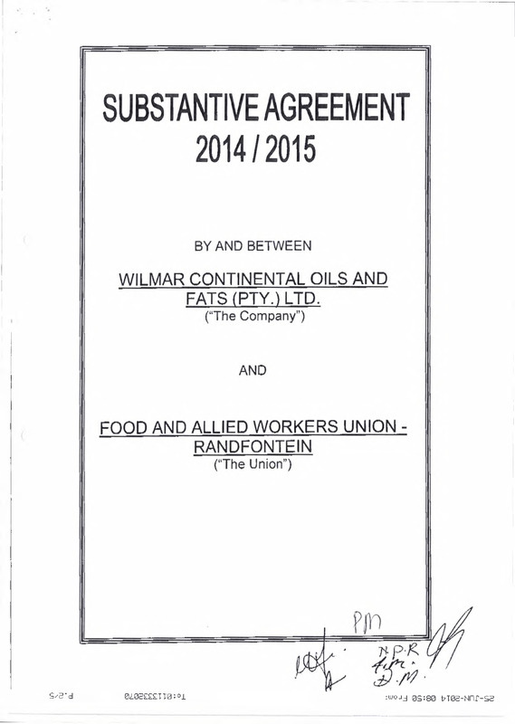 - Substantive agreement 2014/2015 by and between Wilmar Continental Oils and Fats (Pty.) Ltd. and Food and Allied Workers Union - Randfontein