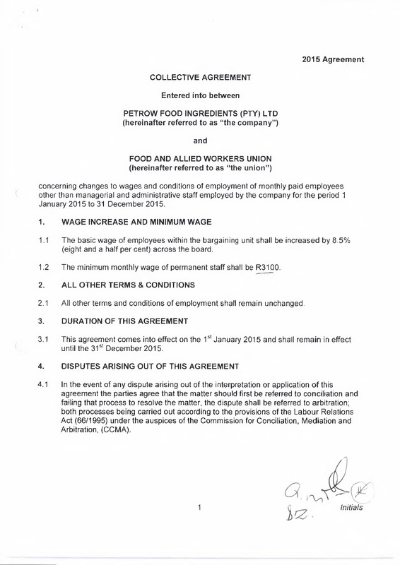 - 2015 Agreement: Collective agreement entered into between Petrow Food Ingredients (Pty) Ltd and Food and Allied Workers Union.