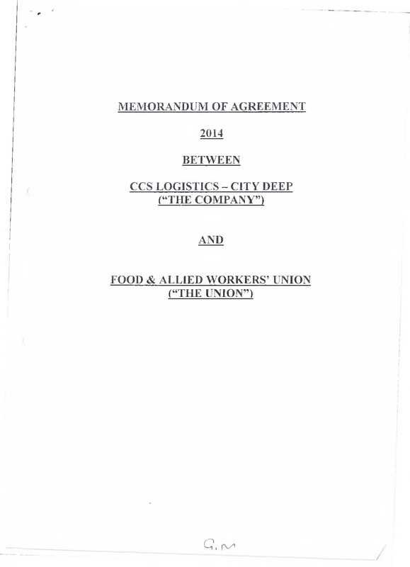 - Memorandum of agreement 2014 between CCS Logistics - City Deep and Food and Allied Workers Union.