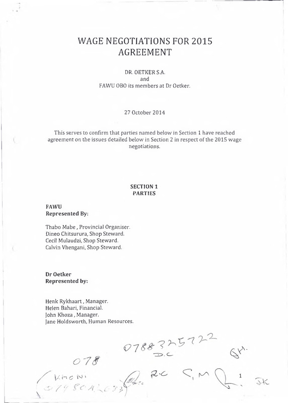 - Wage negotiations for 2015 agreement: Dr. Oetker S.A. and Food and Allied Workers Union and its members at Dr Oetker.