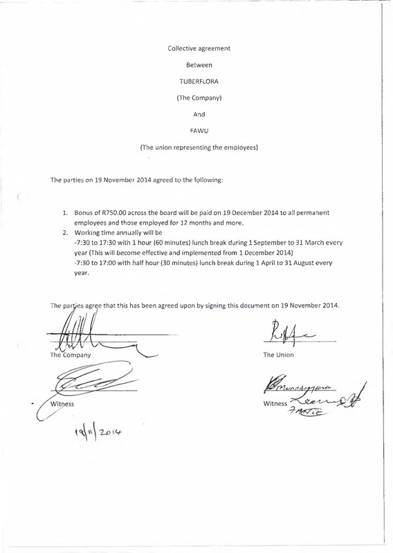 - 2014 Collective agreement between Tuberflora and Food and Allied Workers Union.