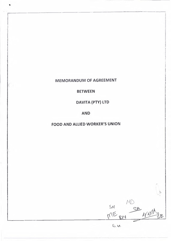 - Memorandum of Agreement between Davita (PTY) LTD and Food and Allied Worker's Union.