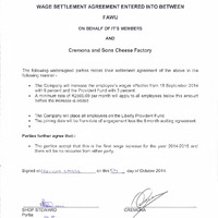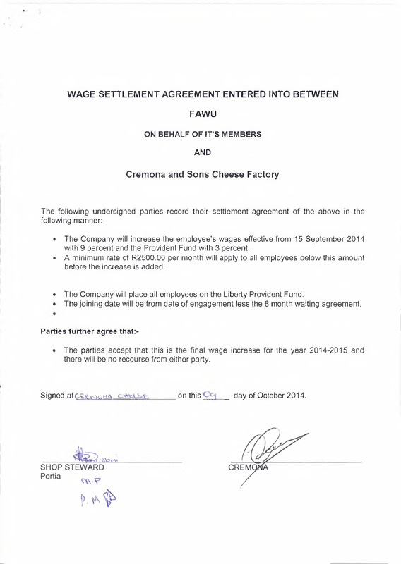 - Wage settlement agreement entered into between FAWU and Cremona and Sons Cheese Factory.