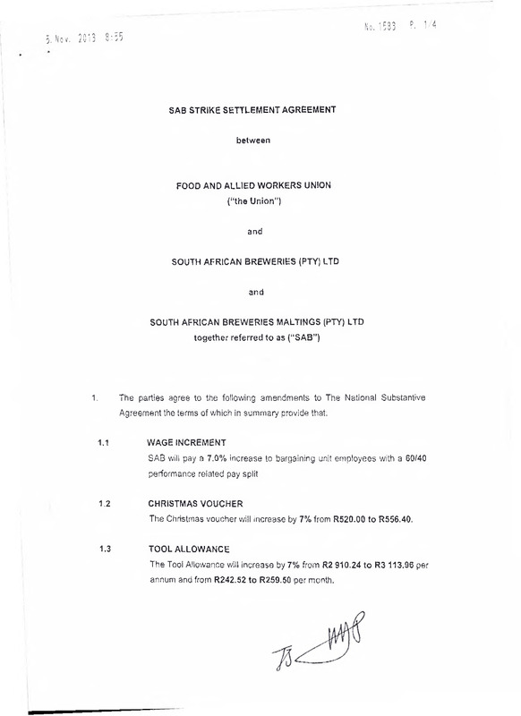 - SAB strike settlement agreement between Food and Allied Workers Union and South African Breweries (PTY) LTD and South African Breweries Maltings (PTY) LTD.