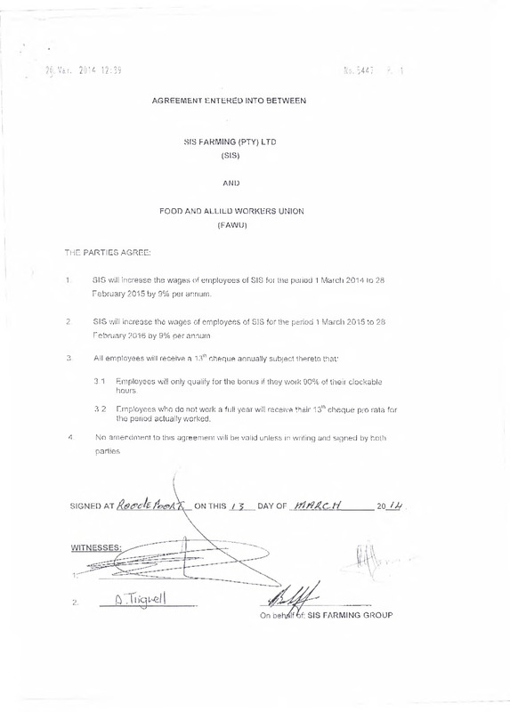 - Agreement entered into between SIS Farming (Pty) LTD (SIS) and Food and Allied Workers Union (FAWU).