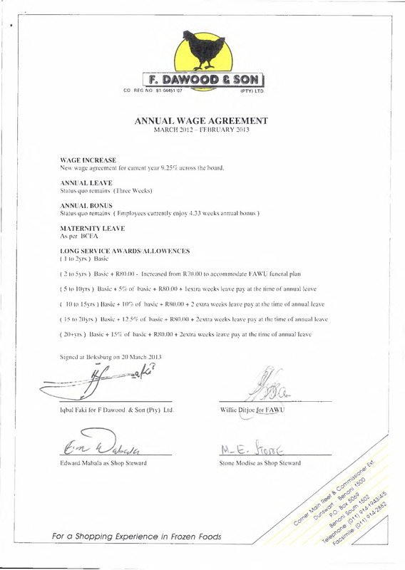 - Annual wage agreement: March 2012 - February 2013. Agreement entered into between two parties, being: F. Dawood & Son (Pty) Ltd the Food and Allied Workers Union (FAWU)