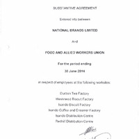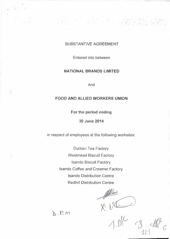 - Substantive agreement entered into between National Brands Limited and the Food and Allied Workers Union for the period ending 30 June 2014.