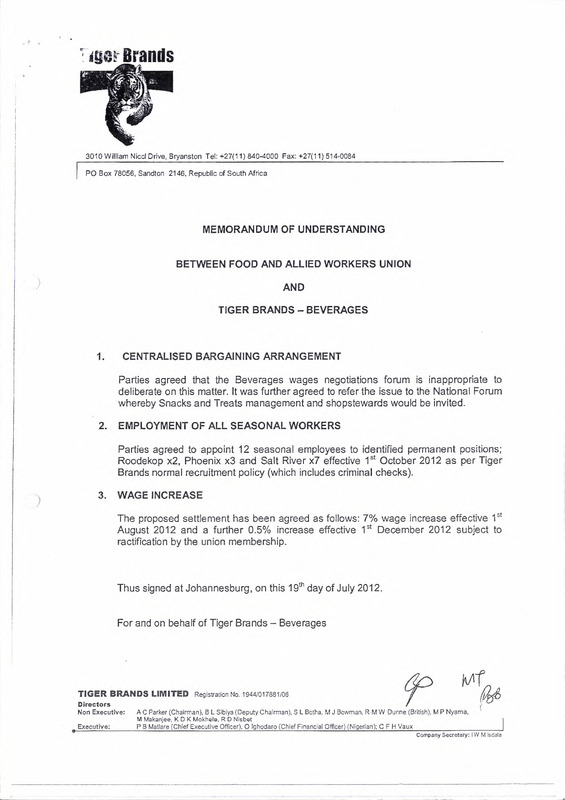 - Memorandum of Understanding between Food and Allied Workers Union and Tiger Brands - Beverages.