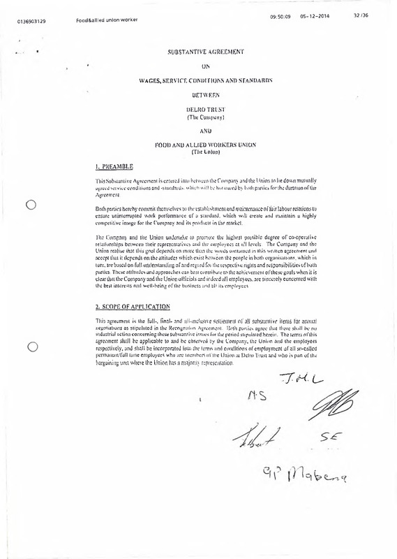 - Substantive agreement on wages, service conditions and standards between Delro Trust and Food and Allied Workers Union