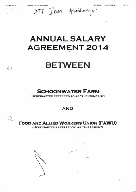 - Annual salary agreement between Schoonwater Farm and Food and Allied Workers Union (FAWU).