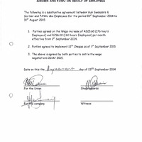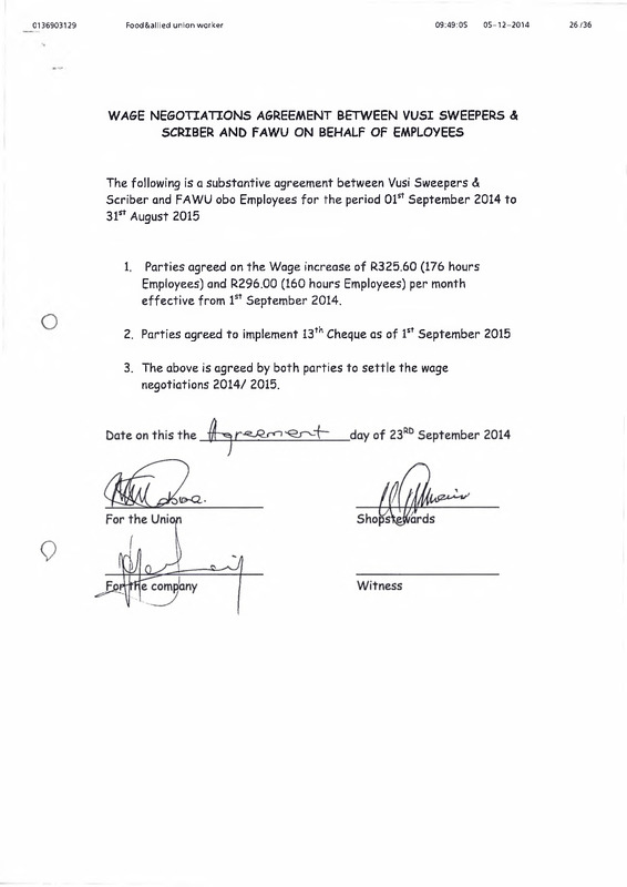 - Wage negotiations agreement between Vusi Sweepers & Scriber and FAWU on behalf of employees.