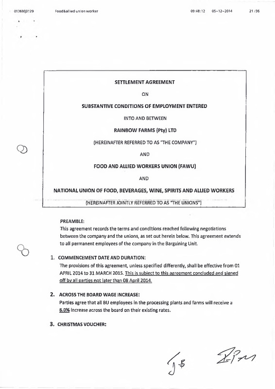 - Settlement agreement on wages & substantive conditions of employment entered into and between Rainbow Farms (Pty) LTD and the Food and Allied Workers Union (FAWU) and National Union of Food, Beverages, Wine, Spirits and Allied Workers