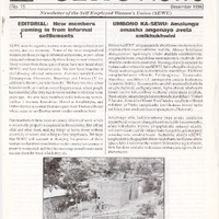 - ewsletter of the Self Employed Women's Union (SEWU). The editorial focuses on organizing marginalized women in informal settlements, peri-urban areas, and hostels (e.g., Inanda, Umlazi, and Dalton Hostel). It includes reports on international exchange visits, including Beauty Ngcobo's trip to India to study SEWA, and Pat Horn and Ruth Masikane's research trip to West Africa (Ghana, Benin, Togo, Cote d'Ivoire, and Senegal).