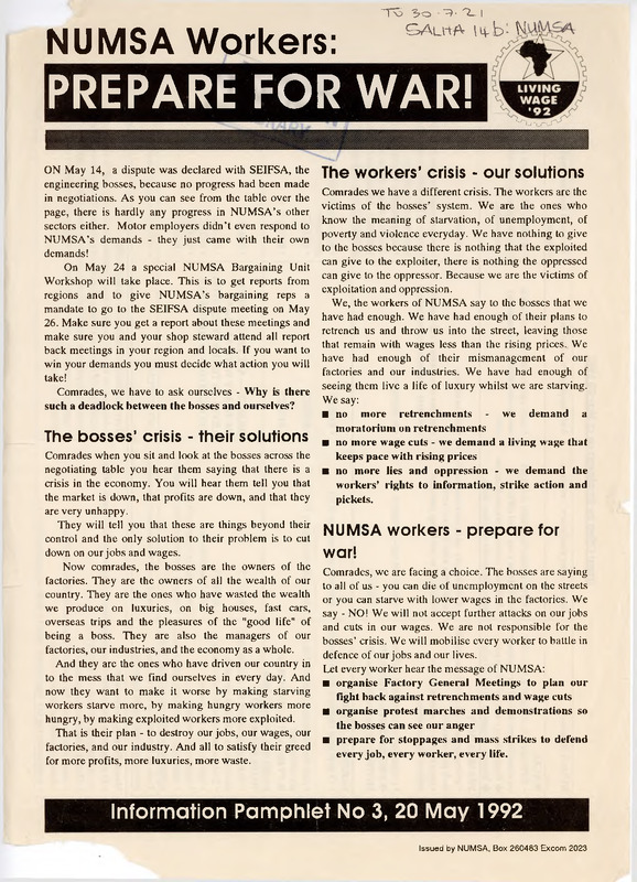 - This archival document is an "Information Pamphlet" issued by the NUMSA head office in Johannesburg during a period of intense industrial unrest in South Africa. The record captures the escalation of a labor dispute between NUMSA and the Steel and Engineering Industries Federation of South Africa (SEIFSA), along with employers in the Motor, Auto, and Tyre/Rubber sectors.