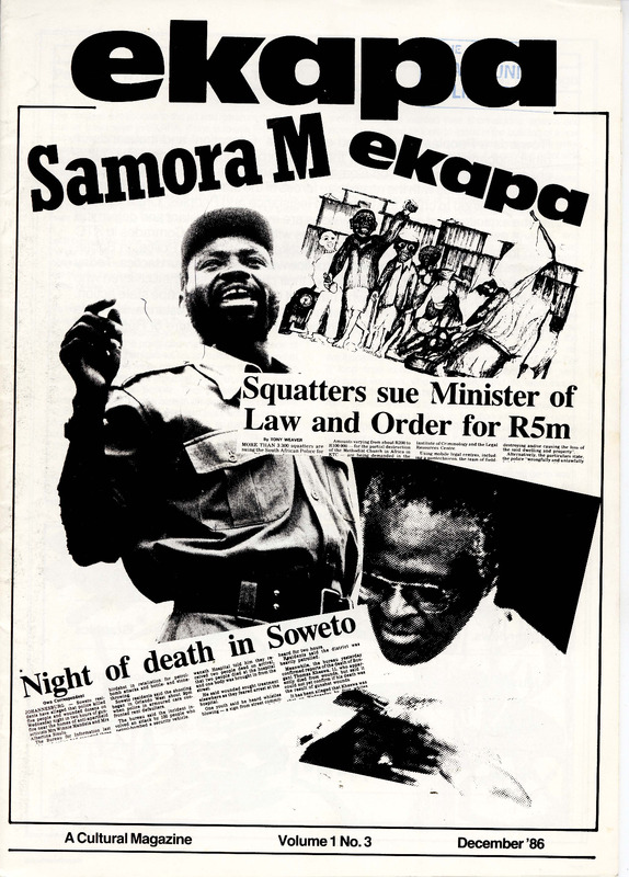 - A resistance-era cultural journal published in December 1986 during the State of Emergency. This issue focuses on "A Culture of Resistance" and includes an editorial on "People's Culture," an interview with jazz vocalist Sathima Bea Benjamin, a legal update on KTC squatters suing the Minister of Law and Order, a tribute to the late Samora Machel, and a historical comparison with the Chilean resistance under Pinochet.