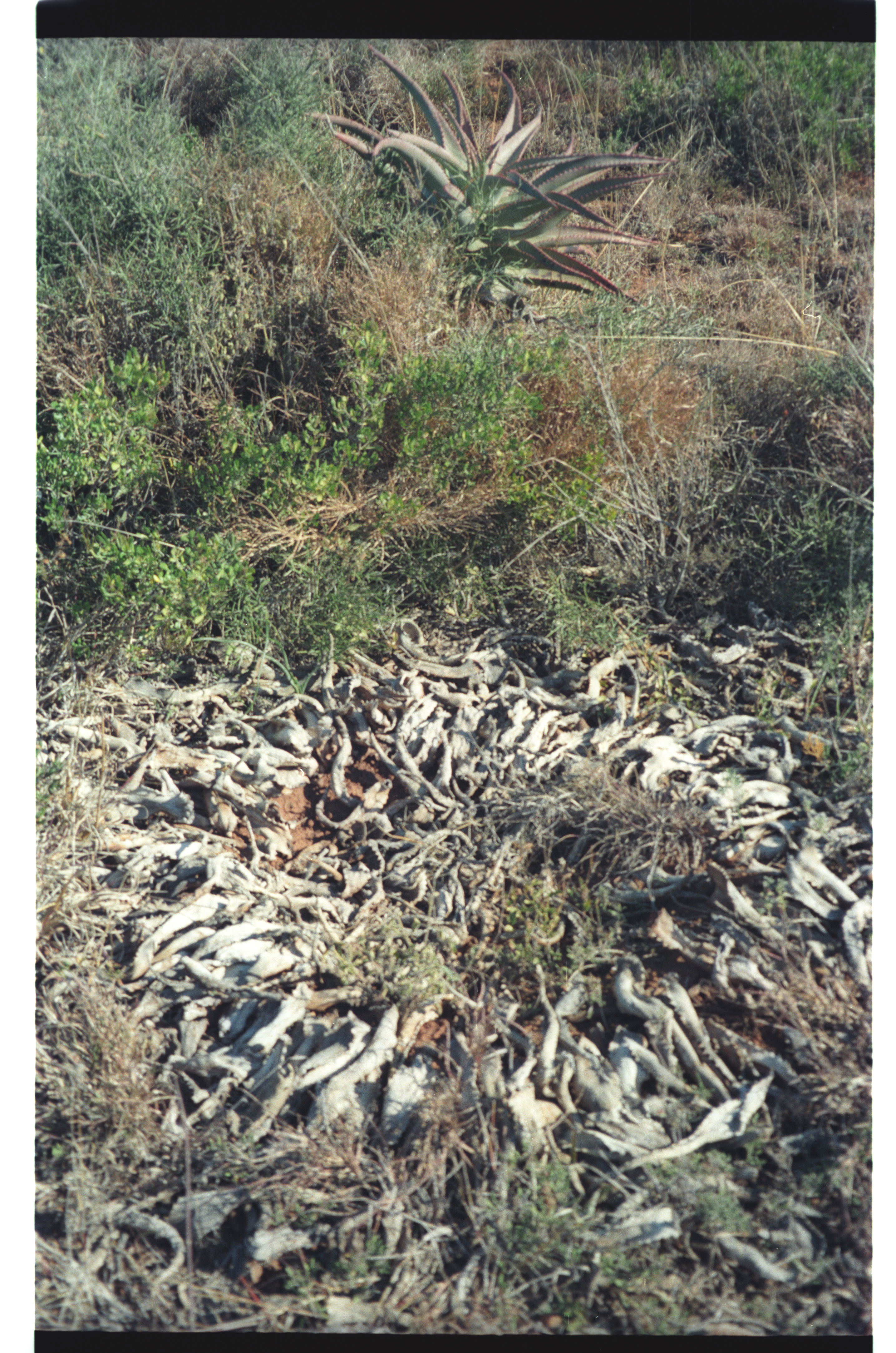 - Old dried out Aloe ferox leaves which have been tapped for their juice and left in the ring-like position in which they were laid for tapping, cut-ends inwards. The juice is used in pharmaceutics.