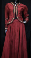 The Edwardian style two piece suit features a blouse and skit made with Dupioni silk which has a shinny appearance and a slightly bumpy texture. The blouse is has gathered sleeves and is lined with white muslin, the front has hook and eyes closures. The blouse measures 37cm on the shoulders and has a length of 55cm, meaning it is suitable for sizes extra small and small. The skirt also includes braided embroidery details and has a waist of 66cm and has a length of 111cm, the back of the skirt extends into a train and suitable for sixes extra small. Condition: Good with no visible staining or tears. This is an item from the Post-Graduate Wall, indicating that it has been purchased or created for a Post-Graduate production. The item cannot be destroyed or adapted as the costume is meant to be preserved following the project. -