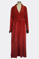The red robe is made with corduroy and is a long-sleeved robe with a length of 137cm. The robe has two belt loops and a matching belt. The sleeves are cuffed at the ends and have a lining of black and brocade silk fabric. The shoulders are structured with shoulder pads. The shoulders measure 43cm, making it suitable for sizes medium. Condition: Good with no visible staining and minimal tearing. This is an item from the Post-Graduate Wall, meaning the item has been bought or made for a Post-Graduate production. The item cannot be destroyed or adapted as the costume is meant to be preserved following the project. -