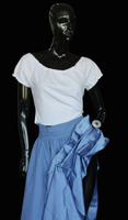 The Azure Blue maxi-length skirt is made with heavy dupion and is lined with silk blue dupion. The skirt includes a waistband, a 35cm zipper and the slit is draped into pleats. The waist measures 65cm, and the length of the dress is 105cm, making it suitable for sizes extra-small. The skit is slightly gathered by the waistline and is sawn into six panels. Condition: Good with no visible staining and tearing, This is an item from the Post-Graduate Wall, meaning item has been bought or made for a Post-Graduate production. The item cannot be destroyed or adapted as the costume is meant to be preserved following the project. -