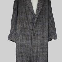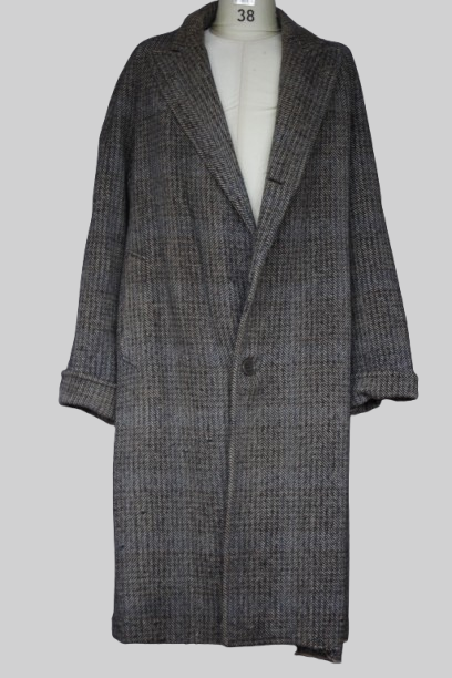 - The knee-length coat is crafted from wool tweed and features a gold silk lining. The coat has a peak lapel, there are button holes with just one button, and the long sleeves have cuffed collars. On both sides, there are two welt pockets, and a slit is located in the back of the jacket. The inside seams are covered with bias binding tape. The coat is not in the best condition, as there is a visible tear on the exterior and on the interior. It was the original performance cloth'- Moss Bros. Condition: Decent with visible staining and tearing, This is an item from the Post-Graduate Wall, meaning item has been bought or made for a Post-Graduate production. The item cannot be destroyed or adapted as the costume is meant to be preserved following the project.