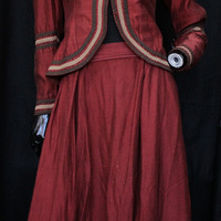 - The Edwardian style two piece suit features a blouse and skit made with Dupioni silk which has a shinny appearance and a slightly bumpy texture. The blouse is has gathered sleeves and is lined with white muslin, the front has hook and eyes closures. The blouse measures 37cm on the shoulders and has a length of 55cm, meaning it is suitable for sizes extra small and small. The skirt also includes braided embroidery details and has a waist of 66cm and has a length of 111cm, the back of the skirt extends into a train and suitable for sixes extra small. Condition: Good with no visible staining or tears. This is an item from the Post-Graduate Wall, indicating that it has been purchased or created for a Post-Graduate production. The item cannot be destroyed or adapted as the costume is meant to be preserved following the project.