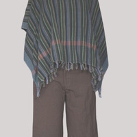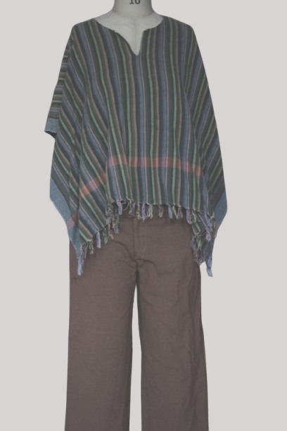 - The Baja Mexican style poncho is made with jacquard wool which is loomed into various colors and vertical lines, the v-neckline is lined with cotton and the hem of the poncho is fringed. The poncho has a length of 68.5cm, making it suitable for all sizes. Condition: Decent with visible staining and tearing, This is an item from the Post-Graduate Wall, meaning item has been bought or made for a Post-Graduate production. The item cannot be destroyed or adapted as the costume is meant to be preserved following the project.