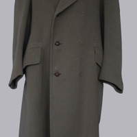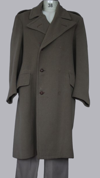 - The camouflage green double-breasted knee-length coat is lined with green rayon. The coat has a peak lapel with a total 8 button holes, 6 of which are on the front closures, two are on the notched lapel, two are on the military style button and strap combination on the strap. The sleeves have two buttonholes at the bottom. There are only buttons that are available are the three on the front closure with mushroom button. are. On both sides, there are flap pockets on the front closure. Condition: Good with no visible staining or tearing. This is an item from the Post-Graduate Wall, meaning the item has been bought or made for a Post-Graduate production. The item cannot be destroyed or adapted as the costume is meant to be preserved following the project.