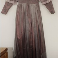 - 1820's Purple Regency Period dress made with mauve power mesh with flower details and magenta silk lining. The dress has pink lace trimmings and mustard ribbon. The length of the dress is 139cm and the back of the dress has hooks and eyes an a train that extends by 40cm.