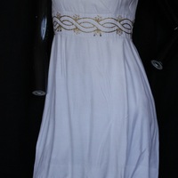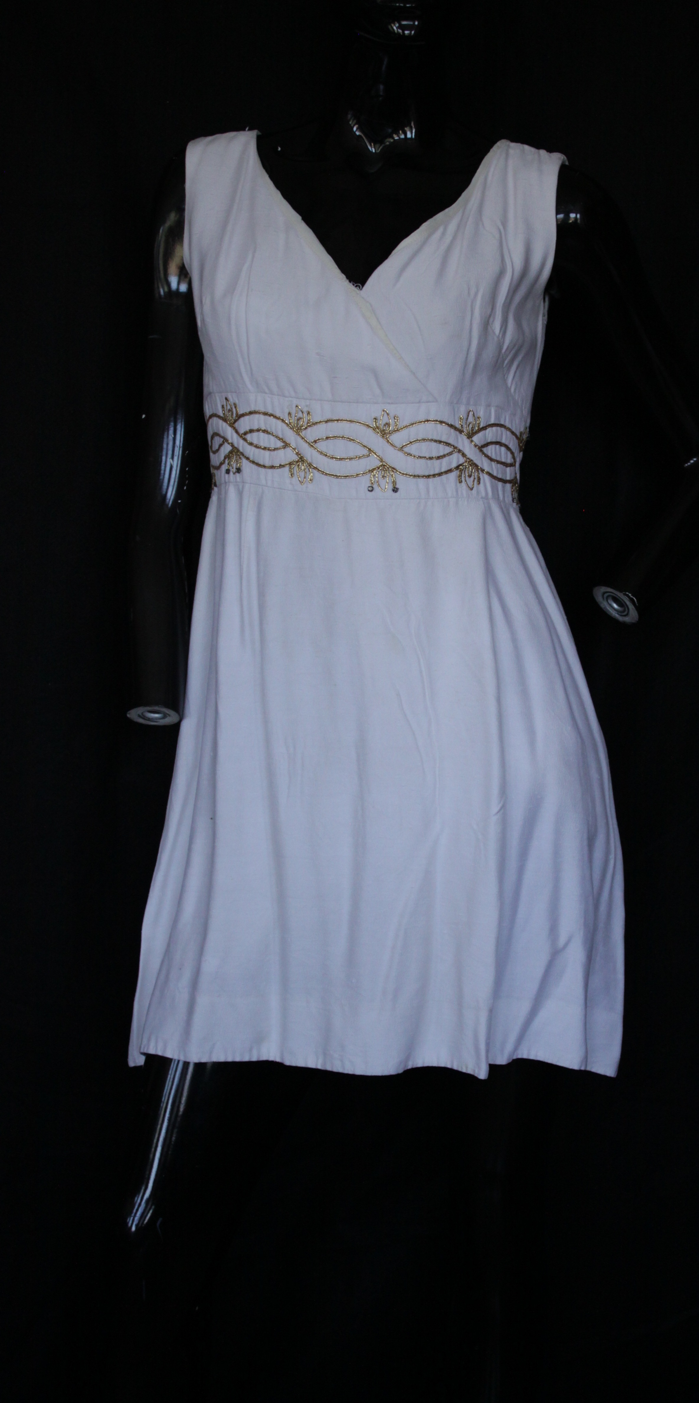- White Grecian Style Dress with Gold Embroidered Waist and V-neck. Material used: floral white Dupion cotton, which is characterised by inconsistent horizontal bumps. Waistline consists of golden trimming and individual diamond trimmings . The dress brand is Jane Paris. size 38. length 90cm. The Dress is lined with off-white silk for the bodice, and the skirt is lined with a white poplin cotton lining. The back of the dress has a 50cm white zipper