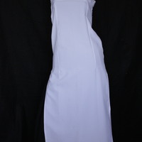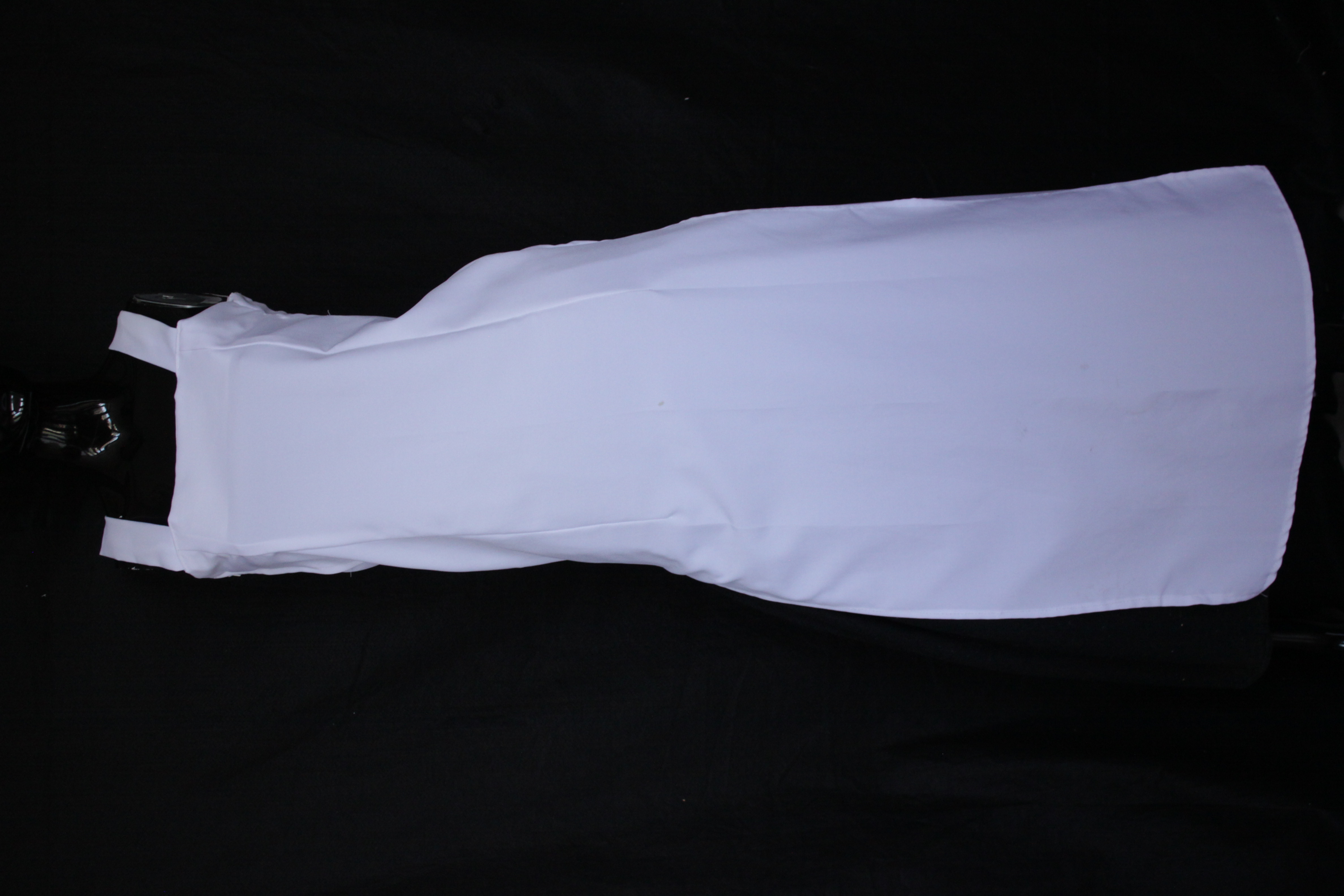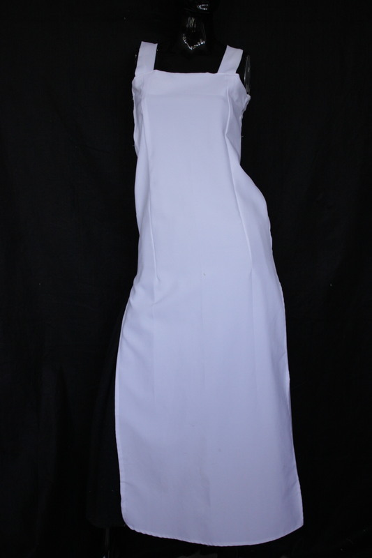 - White Vintage 1970s Apron Full-Length Dress. The dress has a square neckline with thick straps. The sides of the dress have slits and a side 30cm zipper on the right-hand side, and the fabric used is white school tex.
