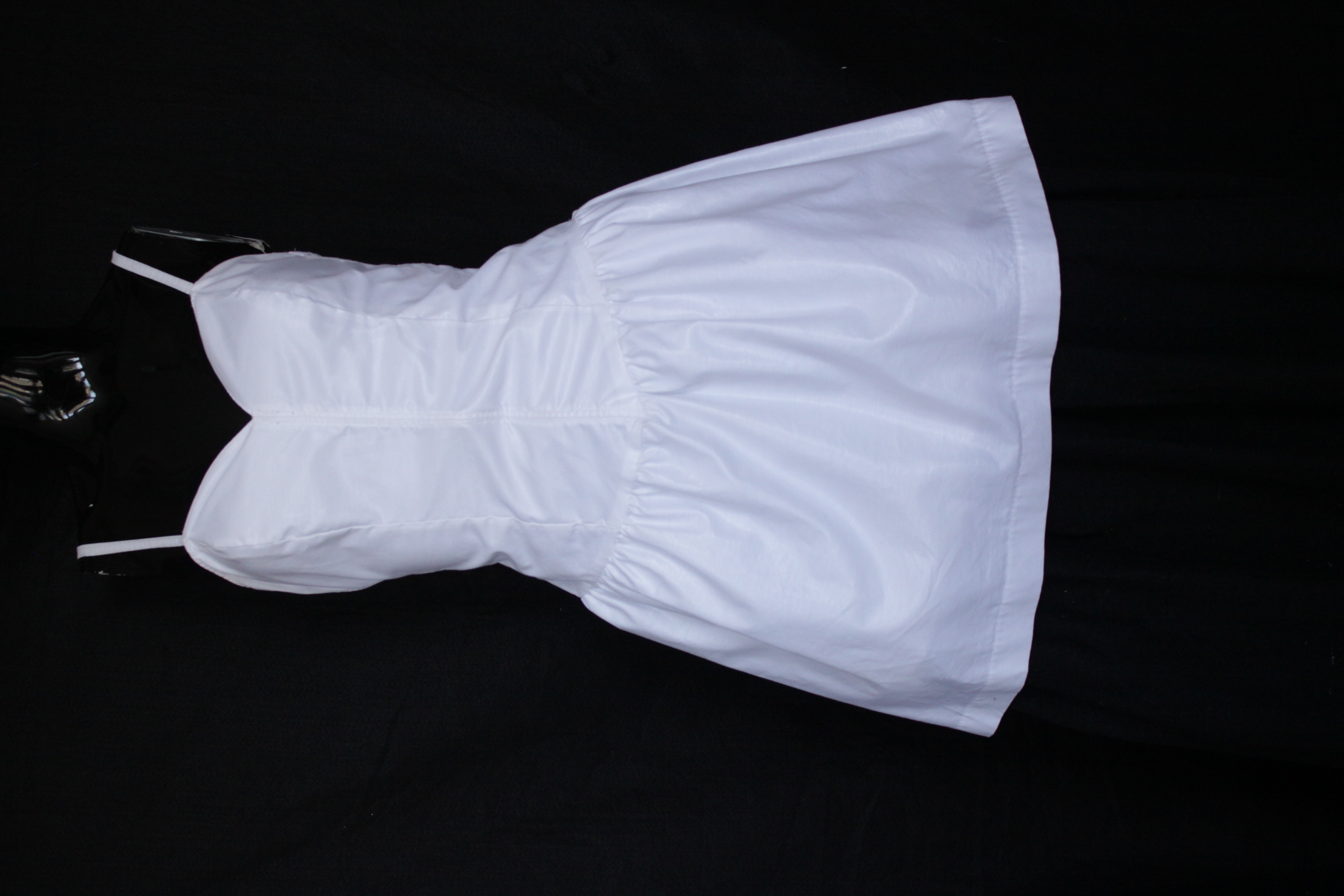 - White Mini Poplin Dress with Corset Bodice. The dress is made with glossy crepe and has a sweet heart neckline with spaghetti straps and a back cleavage, and white satin ribbon. The dress is lined with white fabric and features a 30cm white hem at the lower back. The length is 80cm, and the size is 32.