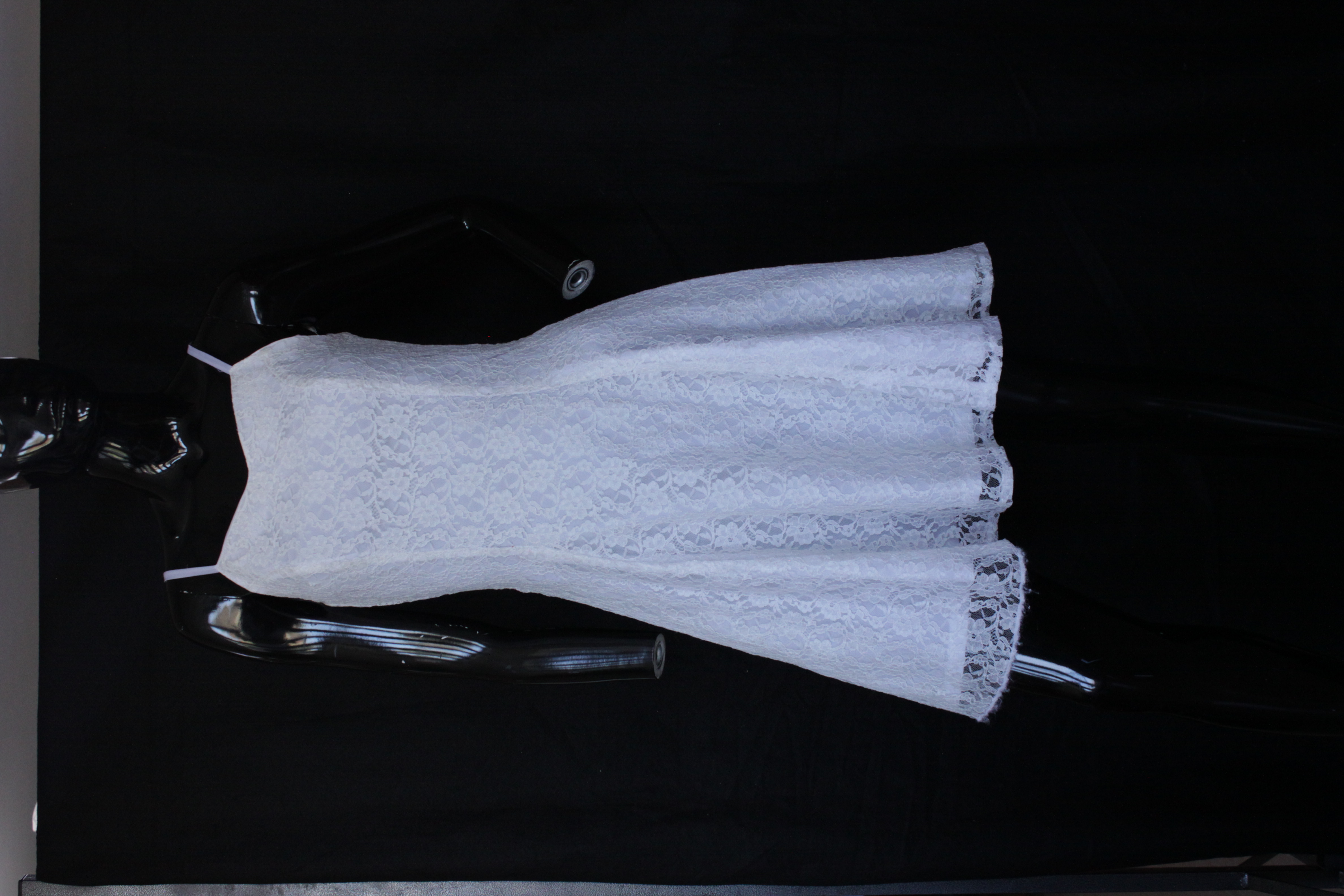 - Short White Lace Mini Dress with Spaghetti Straps. The cocktail dress has a white floral lace lined with white viscose and has white sateen spaghetti straps. The length of the dress is 98cm, and the size is 34cm. The back of the dress has a 40 cm long zipper and a hook and eye at the top.