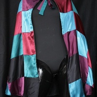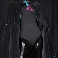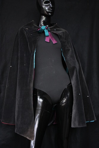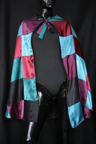 - The cape is a reversible, multi-colored cap made with art silk. The checkered pattern consists of plum purple, marron, teal and black. The Reversible side is made with black velvet material and is detailed with black sequins. The cape is suitable for all sizes and measures 93 cm in length. Condition: Good with no visible staining or tears, This is an item from the Post-Graduate Wall, meaning item has been bought or made for a Post-Graduate production. The item cannot be destroyed or adapted as the costume is meant to be preserved following the project.