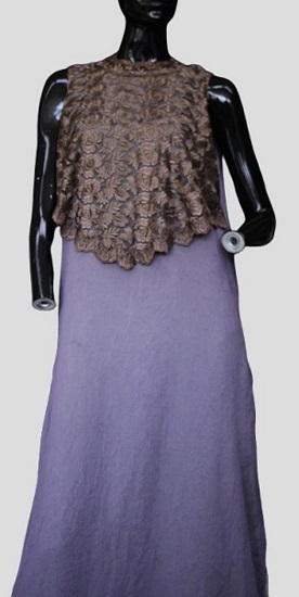 - The dress is made with crinkled chiffon, which has a wrinkled texture. There are three different layers: the first layer is made with gold crinkle chiffon, the second with lavender purple crinkle chiffon and the third layer, which is the bodice half, is made with brown lace embroidery. This is a maxi length dress with slits on the sides and the length of the dress measures at 127cm, the dress is suitable for sizes Medium. Condition: Good with no visible staining or tears. This is an item from the Post-Graduate Wall, meaning the item has been bought or made for a Post-Graduate production. The item cannot be destroyed or adapted as the costume is meant to be preserved following the project.