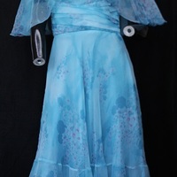 - The dress is made from floral chiffon and features an art silk lining. The dress includes flowy flutter sleeves and has a waistline with pleated details. The waist measures 70cm and has a length of 117cm, with a flared hem at the bottom. The chiffon is an overlay o0ver the art silk the back has 55cm zipper and hook any eye as a closures. The dress is suitable for sizes Small. Condition: Good with no visible staining or tears, This is an item from the Post-Graduate Wall, meaning item has been bought or made for a Post-Graduate production. The item cannot be destroyed or adapted as the costume is meant to be preserved following the project.