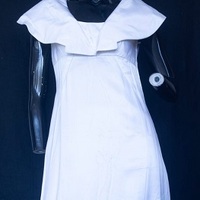 - The white maxi-length dress is made with white duchess fabric, which has a shiny appearance. The dress is lined with linen and the interior has bias tape covering the stiches. The top has a carol collar that extends to the back of the dress. The waist measures 70cm, and the length is 144cm, making it suitable for sizes Small and above. Condition: Good with no visible staining or tears, This is an item from the Post-Graduate Wall, meaning item has been bought or made for a Post-Graduate production. The item cannot be destroyed or adapted as the costume is meant to be preserved following the project.